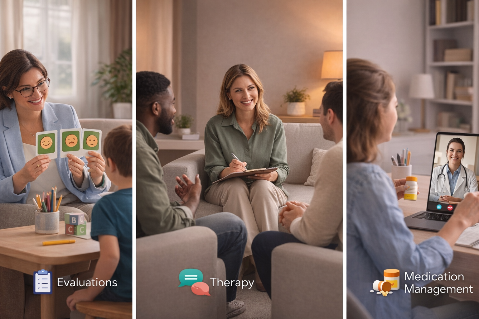 Comprehensive psychiatric medication management services for children, adolescents, and adults, supporting the treatment of ADHD, anxiety, depression, and other emotional or behavioral concerns.